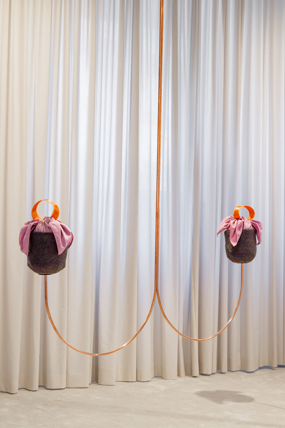 glass beads | copper pipes | cotton yarn | cotton curtains | synthetic carpet | cupro | polyester