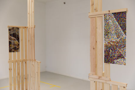 glass beads | shelving modules (HEJNE) | yellow floor tape | towel